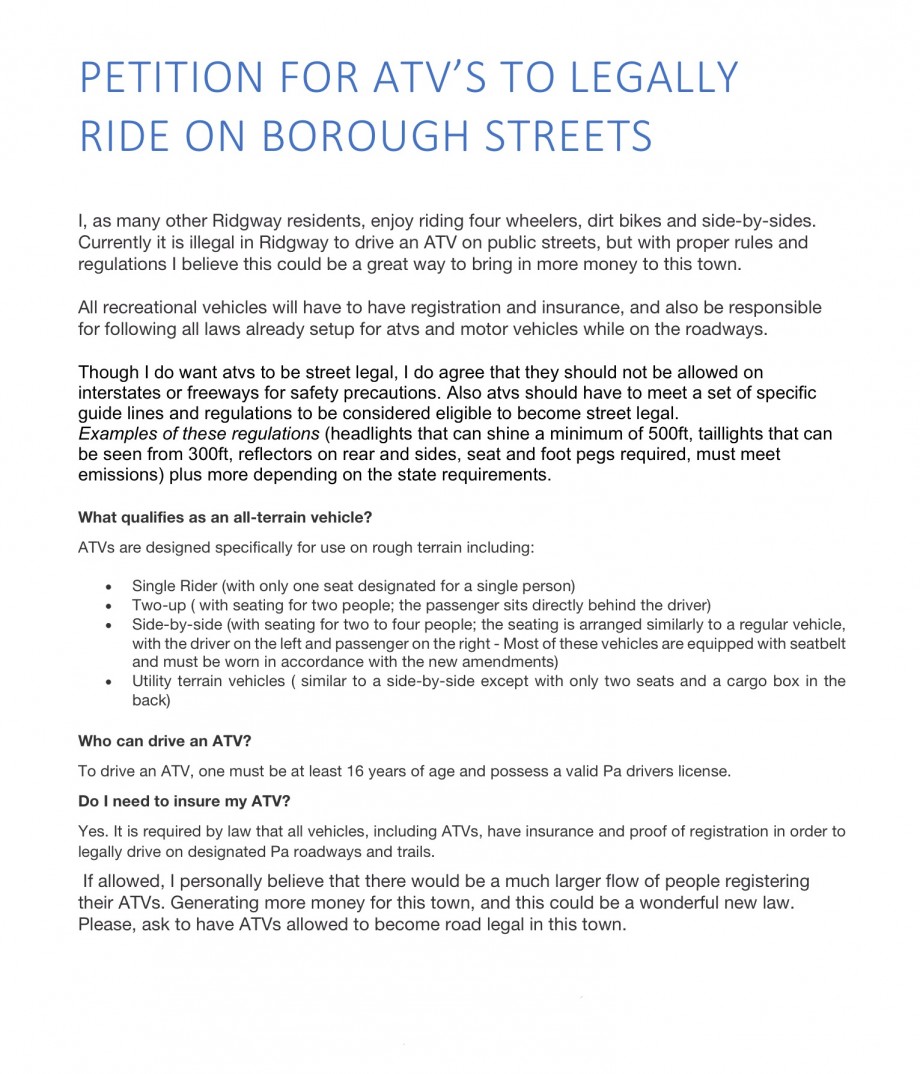 Petition for ATV's to LEGALLY RIDE ON RIDGWAY BOROUGH STREETS