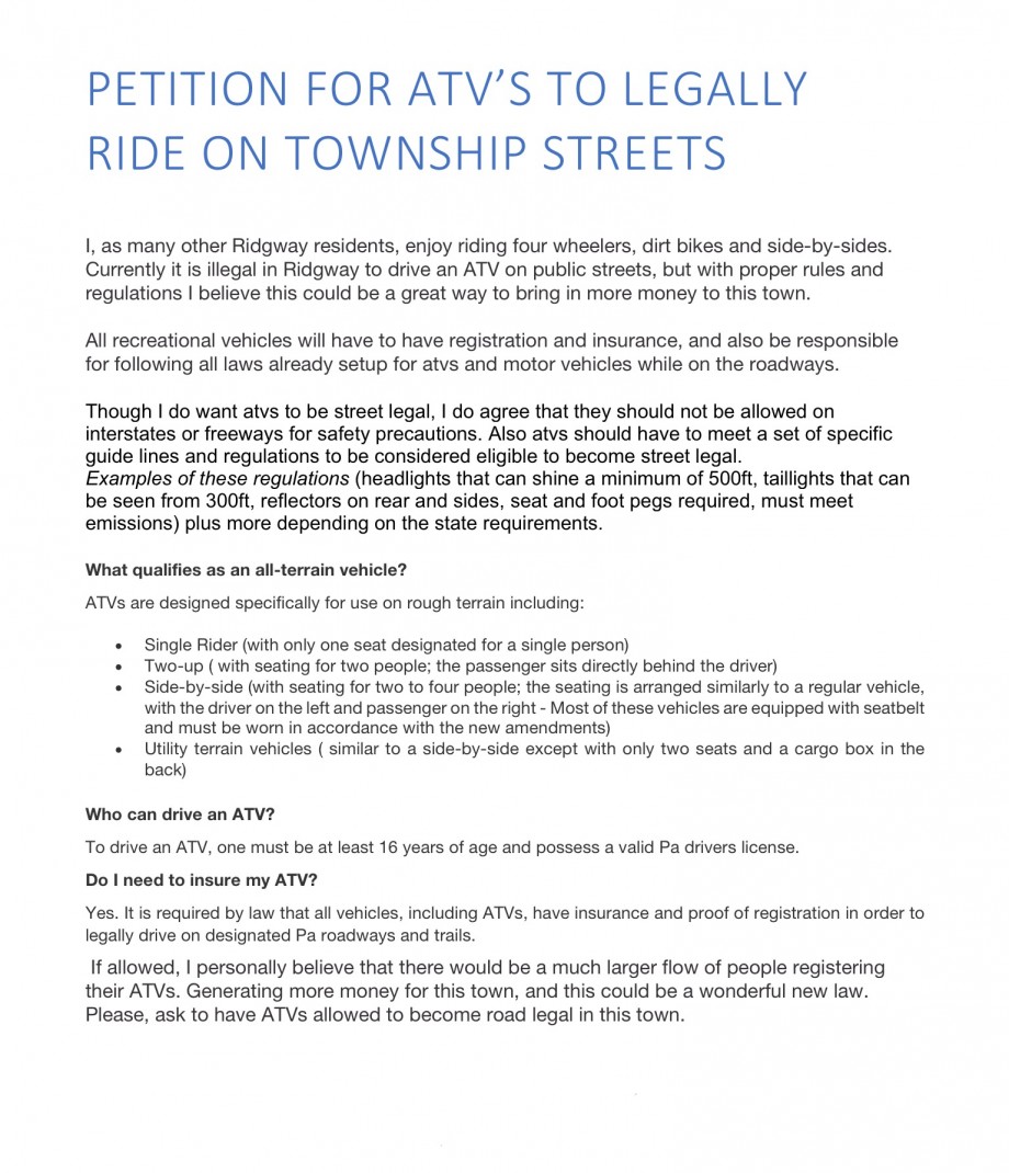 PETITION FOR ATV's TO RIDE LEGALLY ON RIDGWAY TOWNSHIP STREETS