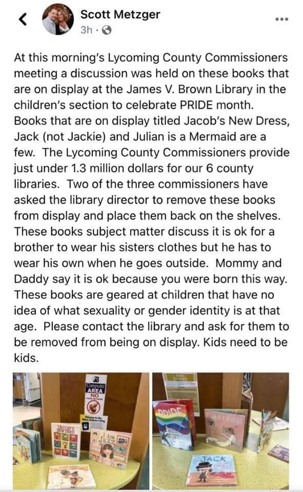 Lycoming County Commissioners Tony Mussare and Scott Metzger have both asked the James V. Brown Library to remove LGBTQA+ supportive books from the display in the children's section. They have been elected to delegate where our tax dollars go and have chosen to use that responsibility to dictate the actions of the public library to fit their own personal politics. When your opinions start to influence your decision making ability, you are no longer competent to complete the duties of a public servant. Scott's Facebook post (attached below) shows his attempt to strongarm the library to bow to his will by pointing out that he has the ability to decide where our tax dollars go. This cannot stand and our public education and information systems needs to be defended. Tony expresses concerns that these books will confuse our "already confused" children. These words and actions invalidate the LGBTQA+ community and will only lead to children feeling more ashamed and ostracized. We must protect these already at-risk youth and let them know that they can be who they are without fear of being looked down on by the very people we've elected to serve them.